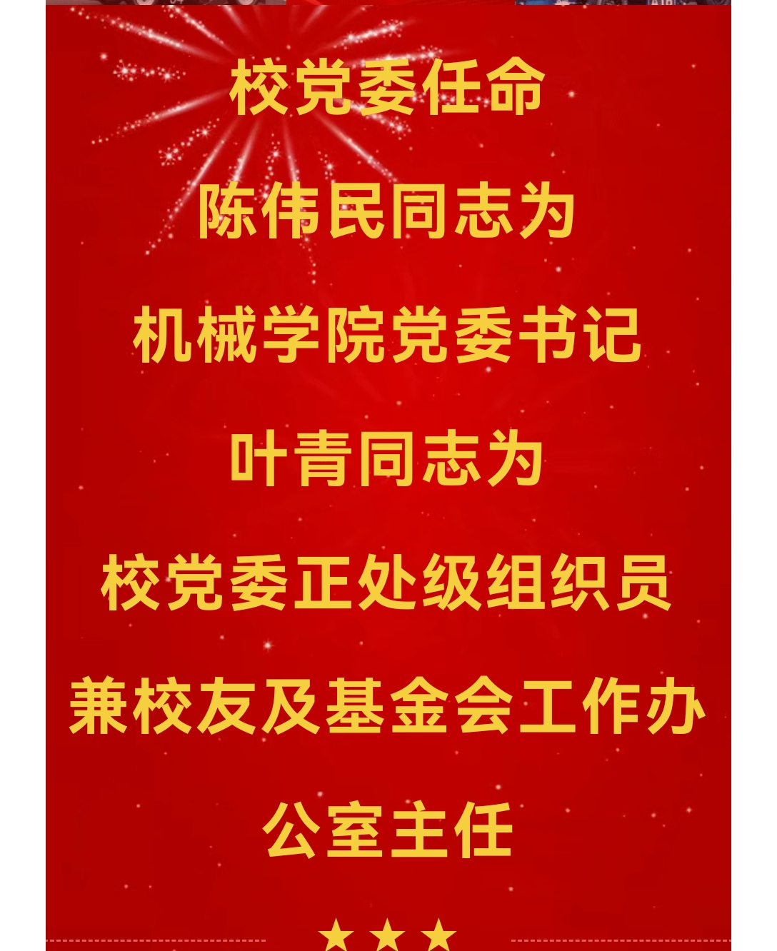校党委任命陈伟民同志为机械学院党委书记,叶青同志为校党委正处级组织员兼校友及基金会工作办公室主任