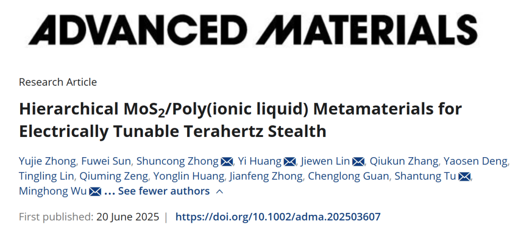 福建省太赫兹功能器件与智能传感重点实验室主任钟舜聪教授团队在国际权威材料期刊《Advanced Materials》上发表题为“Hierarchical MoS2/Poly(ionic liquid) Metamaterials for Electrically Tunable Terahertz Stealth”的研究论文。这项研究展示了一种创新的分级离电架构太赫兹隐身超材料,为大气衰减环境下针对多个太赫兹大气窗口频段的主动可调隐身技术开辟了全新路径,标志着太赫兹波段隐身材料研究领域的重要突破。