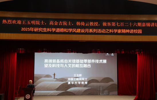 王玉明院士以“高端装备核心关键基础零部件技术展望及科技与人文的相互融合”为题,结合自身在密封技术领域的科研成就与诗意人生,系统讲解了高端装备密封技术的原理特征、关键难点、工业应用及发展趋势,并阐述了对于科学与人文融合的深刻体会。他从“兴趣驱动勤奋”“注重思维方式”“追求真善美的共同价值”“热爱生活”四个方面勉励机械学子自强不息,在实践中探索真知,不断提升人文素养。