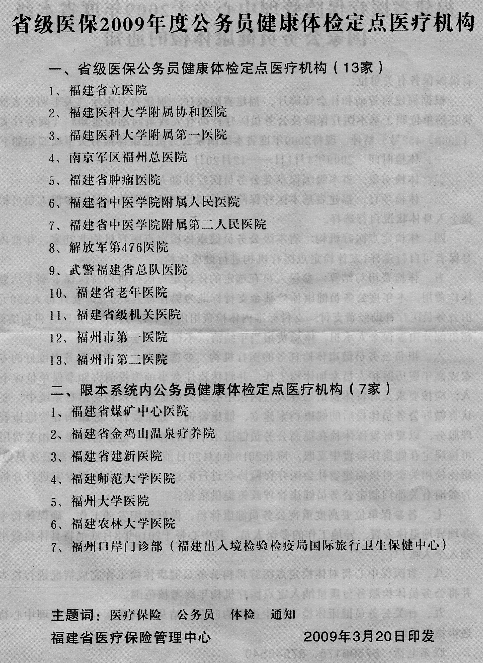 各单位、各学院: 接省医疗保险管理中心通知,2009年度省本级医保公务员健康体检时间延期至2010年2月28日止,请各单位、各学院敦促 本单位尚未参加体检的职工,尽快持本人医保卡前往健康体检定点医疗机构体检,逾期视为自动放弃。 特此通知。 附件:2009年度健康体检定点医疗机构名单(点击打开)海角视频 人事处 2009.12.28