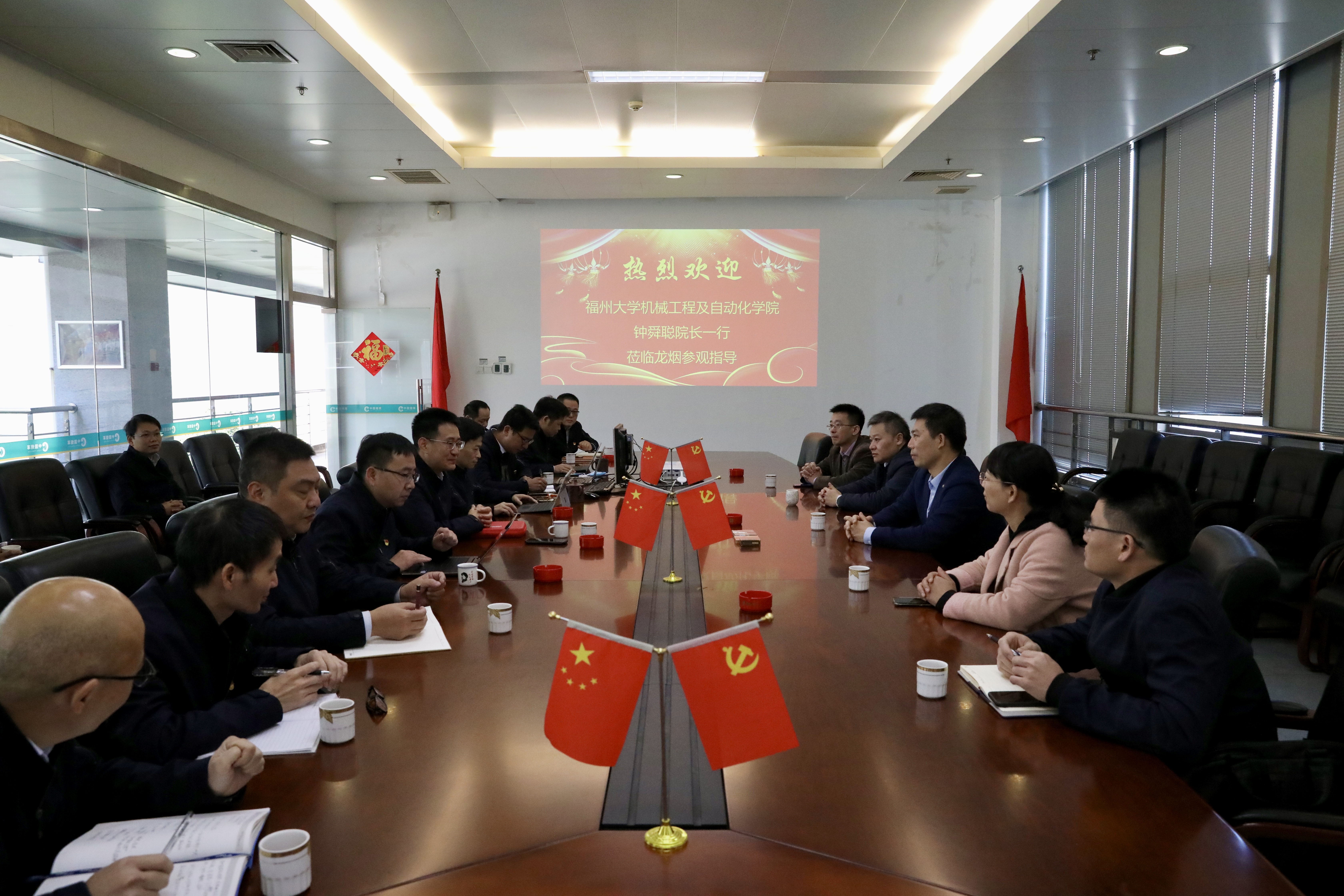 龙岩烟草工业有限责任公司总经理钱继春、制丝车间主任李汉瑞、信息技术部主任郭剑华、人力资源部副主任黄宇斌、卷包车间副主任邱敏以及其他相关部门的领导、技术骨干共22人出席了见面交流会。钱继春总经理简要介绍了龙烟公司的发展历史、现有生产规模及未来发展规划等基本情况。何炳蔚副院长介绍了机械学院在人才队伍、学科建设、科研团队、项目成果等方面的情况。双方表示,要加强学院与龙烟公司联系,深入开展企业发展中的核心技术、关键问题共同科学研究和技术攻关,提升龙烟公司技术人员的科研攻关能力和理论知识水平,同时促进学院科技成果的转移、转化,搭建“产、学、研、用”相结合的技术创新平台。
