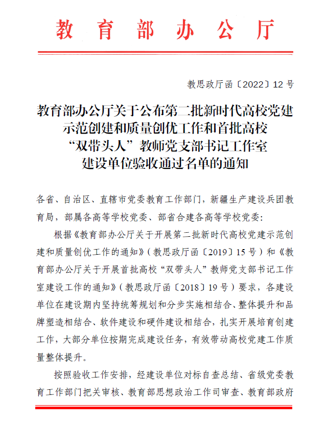 日前,教育部办公厅发布“关于公布第二批新时代高校党建示范创建和质量创优工作和首批高校‘双带头人’教师党支部书记工作室建设单位验收通过名单的通知”(教思政厅函〔2022〕12号),海角视频