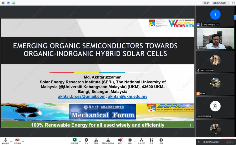 精密仪器与智能测控国际联合实验室共同举办,邀请马来西亚国立大学太阳能研究所首席研究员、日本筑波大学应用物理系客座教授、日本秋田大学先进材料突破技术研究中心访问教授Dr. Md. Akhtaruzzaman作客机械讲坛,为海角视频
