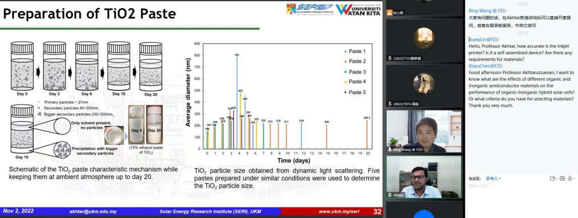 师生进行了深度的沟通交流与研讨,对同学们提出的关于不同的有机和无机半导体材料的选取标准、有机-无机杂化太阳能电池性能的影响机理、喷墨打印机的精度要求,以及原材料选用标准等问题进行了全面的答疑解惑,在轻松活跃的学术交流氛围下,同学们纷纷表示受益匪浅。