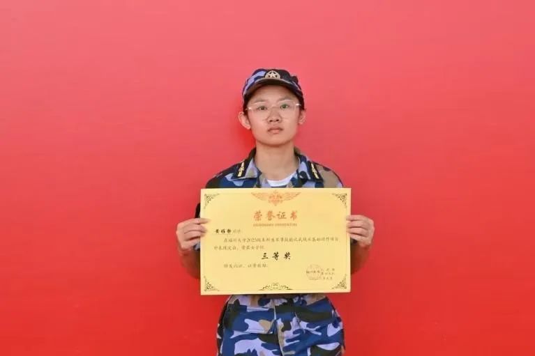 4.黄雅静同学在军事技能比武战术基础动作项目中,荣获女子组三等奖。