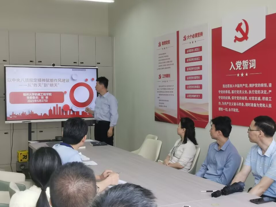 为深入贯彻中央八项规定精神学习教育,进一步加强作风建设,5月27日下午,张俊副院长在机械楼南413会议室,为机械学院机械设计系党员上了题为《以中央八项规定精神赋能作风建设--从“昨天”到“明天”》的专题党课。