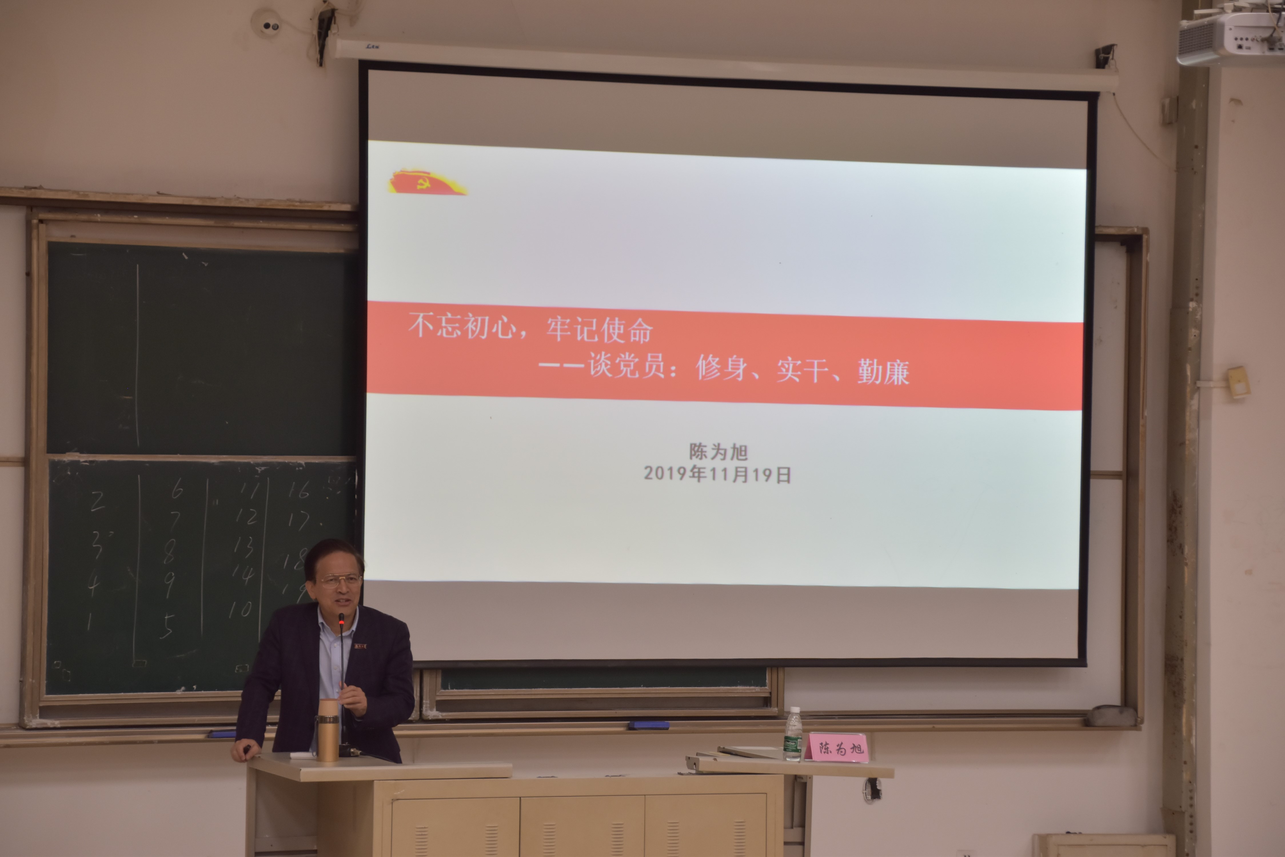 陈为旭书记围绕党员应该做好修身、实干、勤廉三件事展开党课。强调了“不忘初心、牢记使命”八字,提醒我们将来作为中国共产党人要时刻牢记“为中国人民谋幸福,为中国民族谋复兴”这一宗旨,必须坚持修身、实干、勤廉,举了大量实例对做到修身、实干、勤廉的必要性和重要性进行了深入浅出的阐述,为大家加强自身党性修养指明了方向。