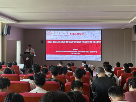 首场报告由广东工业大学机电工程学院原院长、国家科技进步一等奖获得者张永康教授主讲,报告题目为《深远海风电建造装备激光锻造抗疲劳技术研究》。张教授紧密围绕国家深远海风电开发的重大战略需求,系统剖析了海上风电装备在复杂恶劣海洋环境中面临的关键疲劳问题与挑战。他重点介绍了其团队在激光锻造等先进抗疲劳制造技术领域取得的最新研究进展。这些成果对显著提升装备可靠性、有效延长服役寿命具有重要意义,整场报告兼具理论深度与工程应用价值。