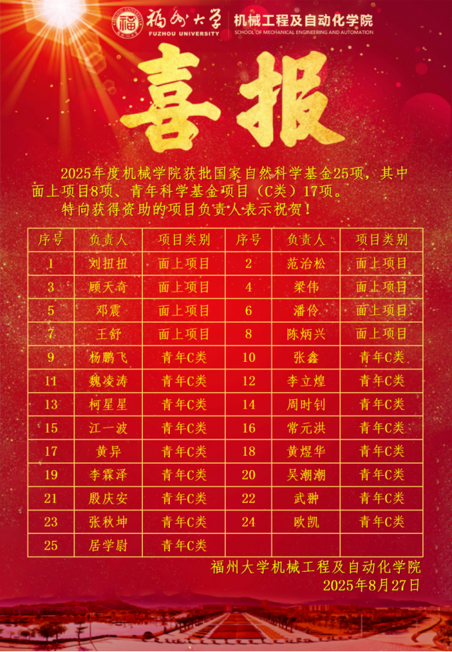 25项立项的成绩为高质量完成“十四五”规划目标奠定坚实基础,并为“十五五”良好开局提供了有力支撑。学院将以此为契机,持续优化人才引育机制和科研环境,强化开展有组织科研,不断提升科研创新能力,争取在更多领域取得更大突破,为推动学院高质量发展、助力学校“双一流”建设、服务国家和福建省战略作出更大贡献。