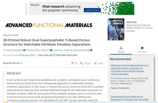 近日,我院任志英教授课题组在材料领域国际顶级期刊《先进功能材料》(Advanced Functional Materials,中科院SCI一区TOP期刊,影响因子19.924)上在线发表研究成果“3D打印自适应双超疏水的钛基多孔结构以用于可切换油/水乳液分离”(3D-Printed Robust Dual Superlyophobic Ti-Based Porous Structure for Switchable Oil/Water Emulsion Separations)。该成果以海角视频