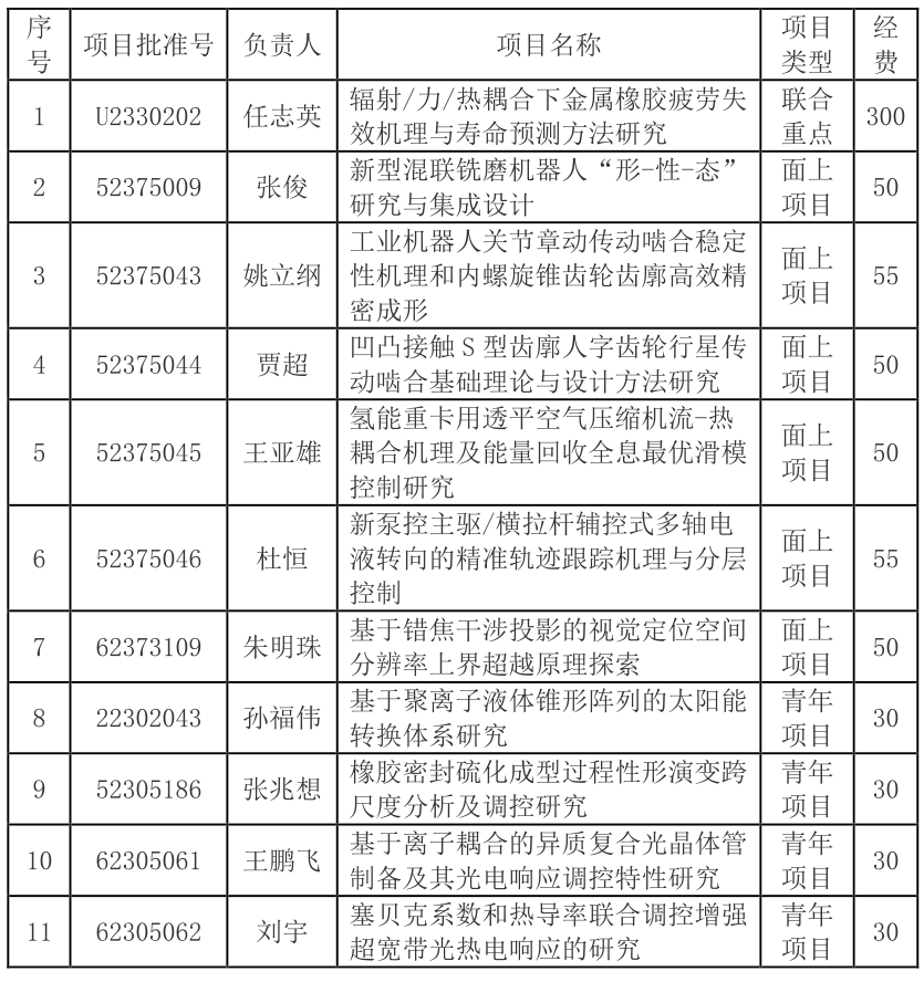 教师共获批国家自然科学基金项目11项,其中联合重点项目1项、面上项目6项、青年项目4项,连续两年在获批总量上突破两位数。其中,任志英教授负责的“辐射/力/热耦合下金属橡胶疲劳失效机理与寿命预测方法研究”项目获NSAF联合基金重点支持项目资助,这标志着海角视频