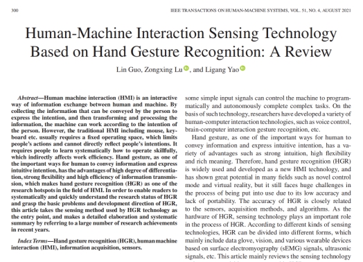 文献:Guo Lin, Lu Zongxing, Yao Ligang. Human-Machine Interaction Sensing Technology Based on Hand Gesture Recognition: A Review. IEEE Transactions on Human-machine Systems, 2021, 51(4): 300-309.