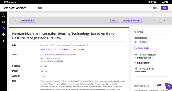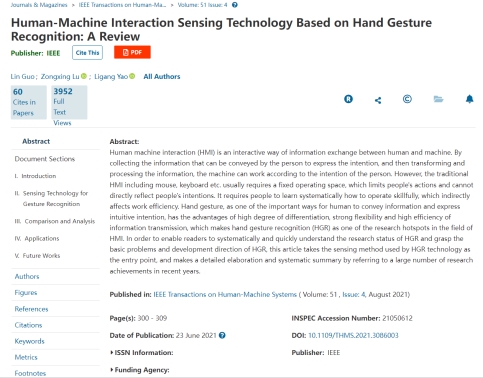 Human-Machine Interaction Sensing Technology Based on Hand Gesture Recognition: A Review该文由郭霖、卢宗兴和姚立纲教授共同编撰。本文旨在使读者能够系统、快速地了解手势识别的研究现状,揭示手势识别的基本问题和发展方向。文章以手势识别技术所采用的传感方法为切入点,通过总结近年来人机交互领域的研究成果,详细的阐述人机交互系统的研究现状,并展望未来人机交互领域的发展方向。目前,该论文在WebofScience上实时引用为48次。