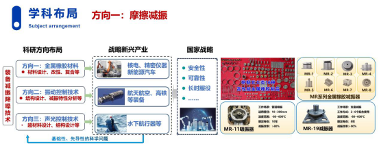 (1)摩擦减振领域。从减振关键基础件金属编织物(金属橡胶)的设计方法与干摩擦耗能机理出发,研制了包括减振垫、减振环及非线性隔振器等五大系列16种高性能金属橡胶产品,成功解决了核辐射、高温环境下核电机组VVP母管与小支管、动力设备、舰船高温管道、机载电子设备等振动抑制的技术难题,故障率大幅下降,有力保障了我国核动力装备、深海舰船、核电等“国之重器”安全可靠服役。