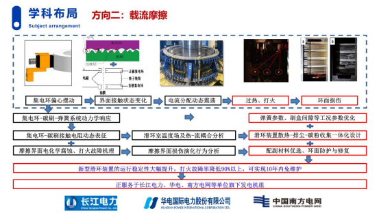 (2)载流摩擦领域。通过分析发电机组集电环-碳刷载流摩擦界面过热、打火、电蚀等故障机理及关键致因,进行滑环装置散热-排尘-碳粉收集功能结构一体化设计,大幅提升系统的运行稳定性,可实现10年免维护。该技术服务于长江电力、华电集团、南方电网等大型发电企业旗下发电装备。