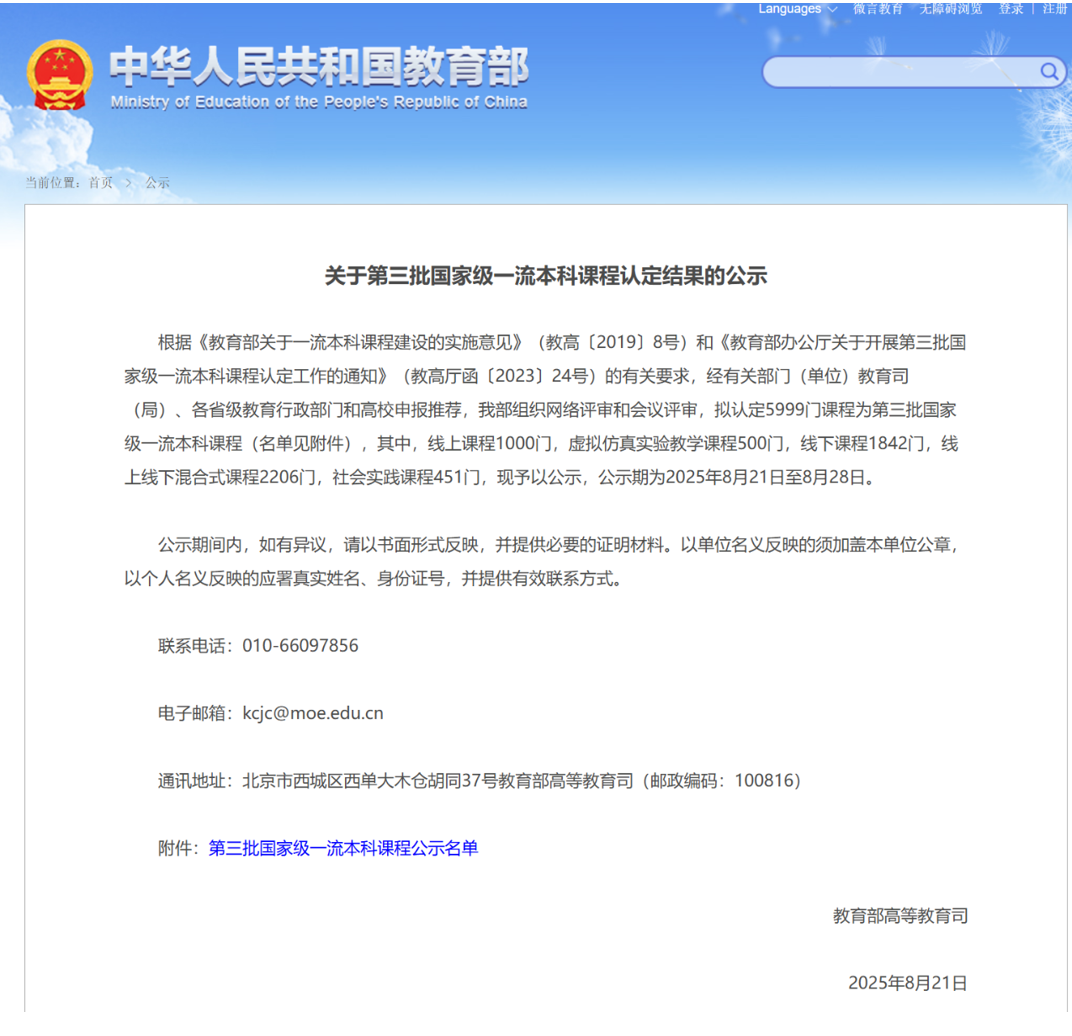 近日,教育部高等教育司发布《关于第三批国家级一流本科课程认定结果的公示》,海角视频