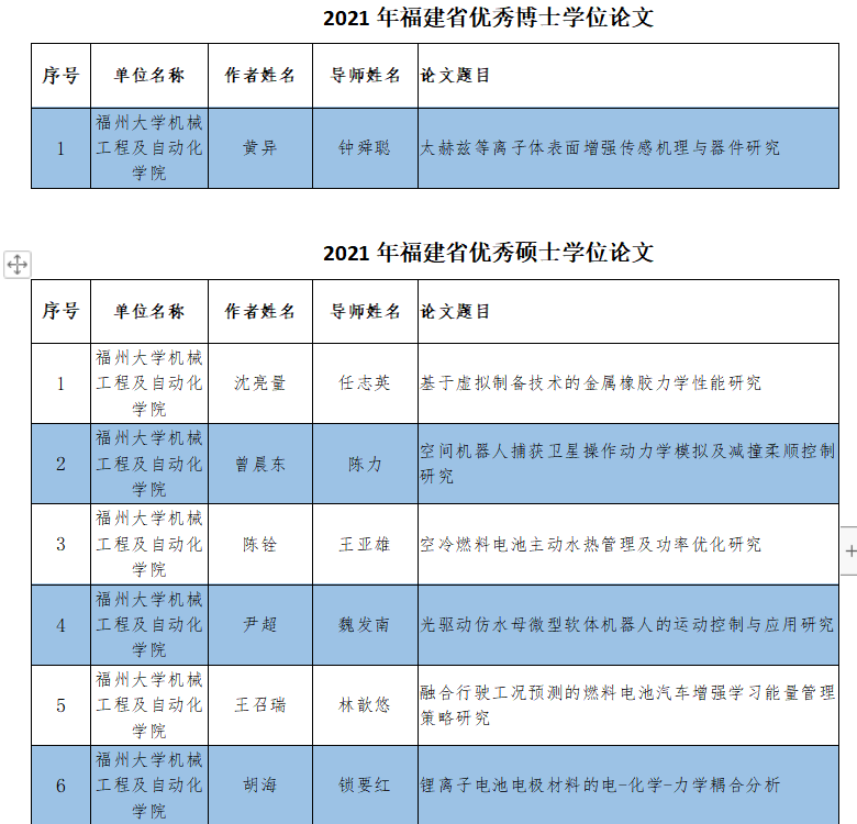 近日,福建省教育厅、福建省学位委员会发布《关于公布2021年福建省研究生优秀学位论文评选结果的通知》,根据省学位办《关于开展2021年福建省研究生优秀学位论文评选工作的通知》(闽学位办〔2022〕2号),经培养单位推荐、专家评审,钟舜聪教授指导的2017级博士研究生黄异题为《太赫兹等离子体表面增强传感机理与器件研究》的学位论文荣获2021年“福建省优秀博士学位论文”;任志英教授指导的2018级硕士研究生沈亮量题为《基于虚拟制备技术的金属橡胶力学性能研究》的学位论文、陈力教授指导的2018级硕士研究生曾晨东题为《空间机器人捕获卫星操作动力学模拟及减撞柔顺控制研究》的学位论文、王亚雄教授指导的2018级硕士研究生陈铨题为《空冷燃料电池主动水热管理及功率优化研究》的学位论文、魏发南副教授指导的2018级硕士研究生尹超题为《光驱动仿水母微型软体机器人的运动控制与应用研究》的学位论文、林歆悠副教授指导的2018级硕士研究生王召瑞题为《融合行驶工况预测的燃料电池汽车增强学习能量管理策略研究》的学位论文、锁要红教授指导的2018级硕士研究生胡海题为《锂离子电池电极材料的电-化学-力学耦合分析》的学位论文荣获2021年“福建省优秀硕士学位论文”。以上7位博硕士学位论文的入选是海角视频