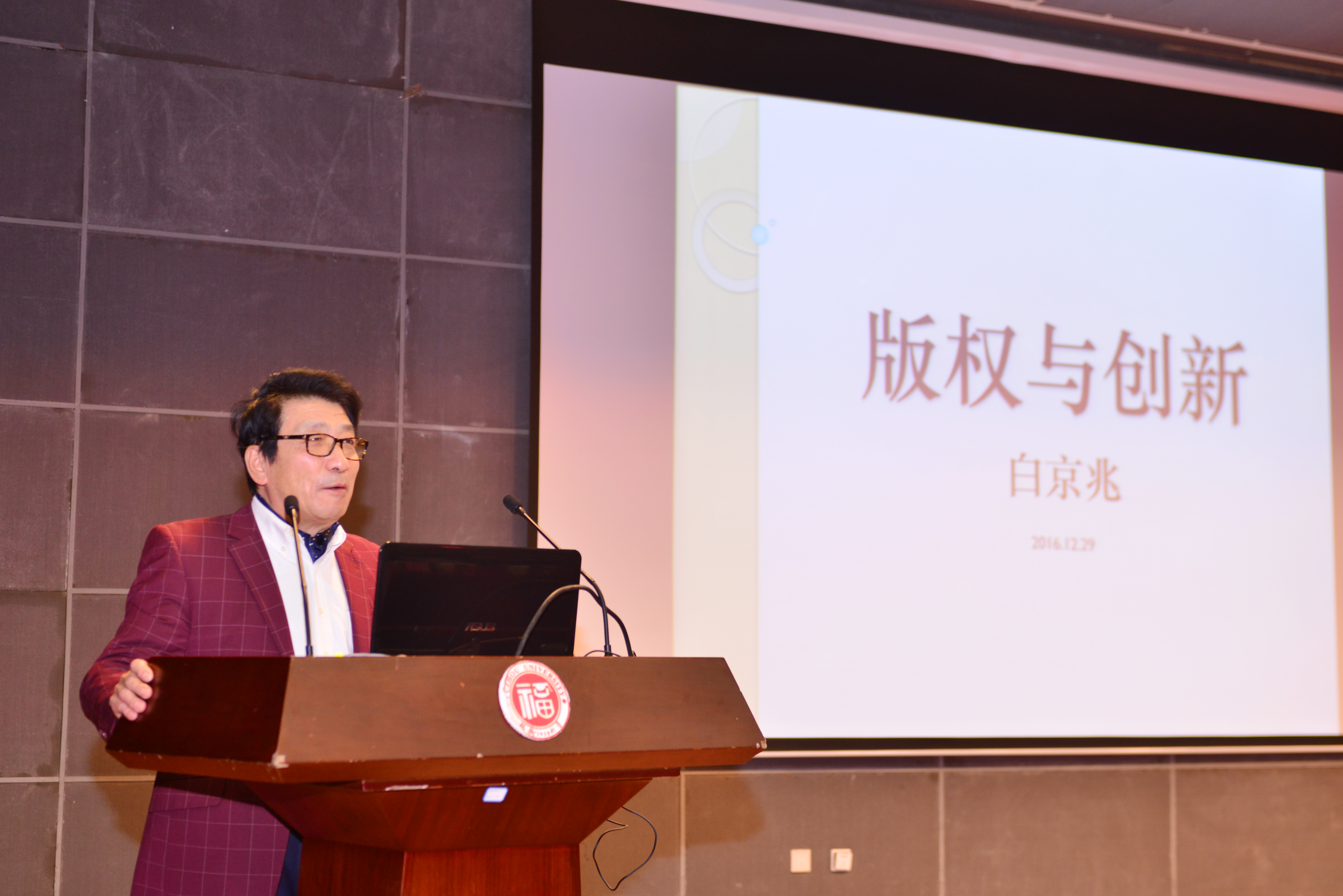 论坛开始,白京兆先生分别就专利权、著作权和商标权的定义引入本次论坛主题,向同学们分享了有关版权和创新方面的知识。而后,他说,英国自从1709年通过第一部版权法后,国内的发明和创新立刻就赶超了当时欧洲文化、经济中心法国,可见版权法对一个国家的创新有多重要,而我国在1990年通过了《中华人民共和国著作权法》。白京兆先生就荷兰霍夫曼设计的大黄鸭进行举例,他说,香港第一次出现大黄鸭后,大陆许多城市也进行了模仿,到处都可以看到大黄鸭,然而这些模仿大多被告,不但撤下大黄鸭,有的还赔了钱。