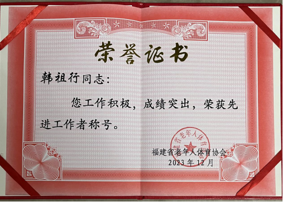 据悉,韩祖行老师老有所为,老有所乐,积极参与福大老体协工作,经常组队参加各种乒乓球友谊交流活动,荣获2023年福建省老体协先进工作者。