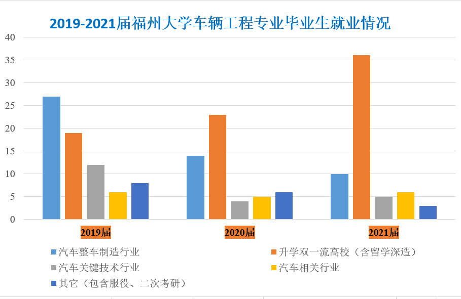 统计2019、2020、2021届车辆工程专业毕业生的去向,几乎全部从事本专业紧密相关的行业,如汽车整车和零部件系统研发、制造企业,或继续攻读车辆工程专业的硕士研究生,占比90%以上。毕业生质量获得社会的普遍认可。