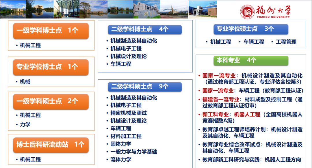 学院涵盖机械工程、力学和材料科学与工程3个一级学科,拥有机械工程一级学科博士点、机械专业学位博士点和机械工程博士后科研流动站,二级学科博士点4个,一级学科硕士点2个,二级学科硕士点9个,专业学位硕士点3个。机械工程学科在第五轮学科评估排名中位列福建省第一。机械设计制造及其自动化和车辆工程获批国家级一流本科专业建设点,并通过工程教育专业认证;材料成型及控制工程获批省级一流本科专业建设点;机器人工程为新工科专业。学院现有1门国家级一流本科课程、8门省级一流本科课程,获国家级教学成果奖3项,省教学成果奖12项。学院现有拥有教育部重点实验室、福建省高端装备制造协同创新中心、福建省制造业数字化设计工程研究中心等19个省级科研平台,获福建省科技进步一等奖7项。