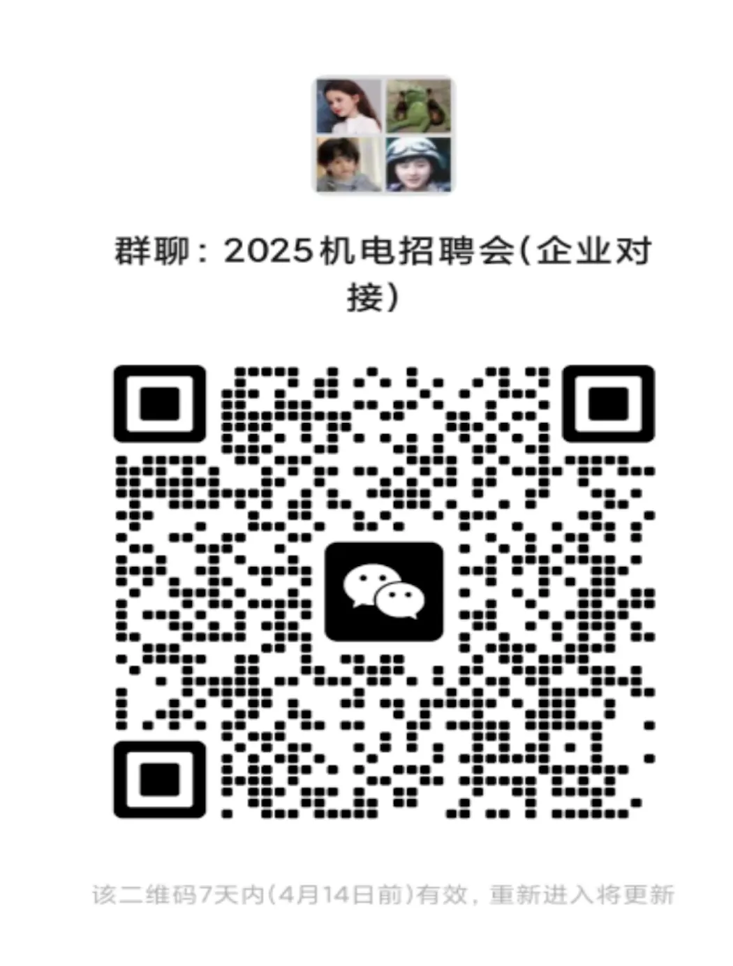 每家参会单位入校招聘人员不超过2人,各参会单位请于2025年4月8日15:00前点击链接(//www.wjx.cn/vm/h702XXj.aspx# )或扫描下方二维码填写入校人员名单,并加入微信群聊。