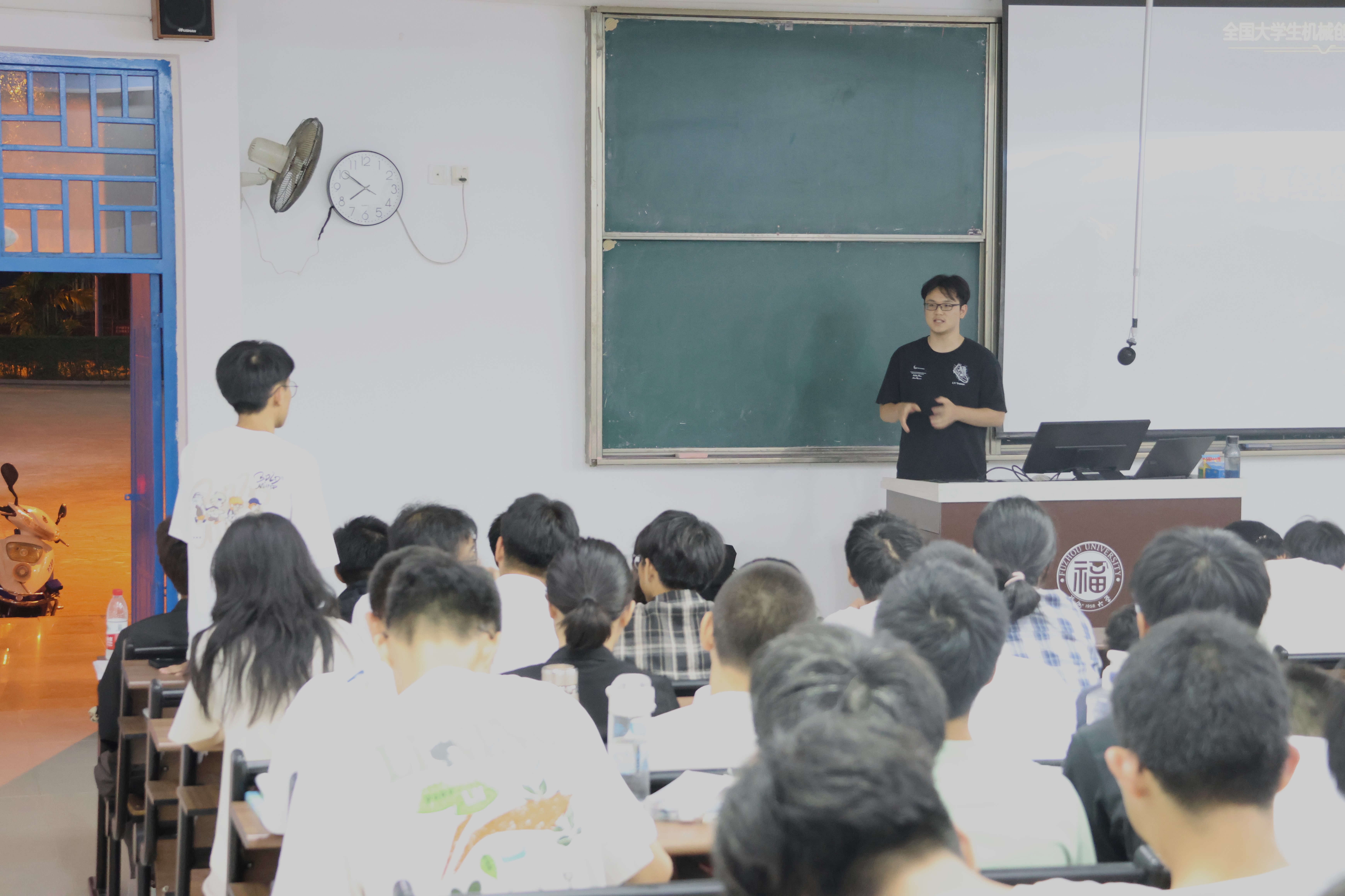 彭良辉同学是机械创新设计大赛莴笋收割机队队长,在第十一届全国大学生机械创新设计大赛兴农机械赛道获得国家三等奖。在讲座中,他在会中对全国大学生机械创新设计大赛的赛事要求进行讲解,其后展示了若干获奖作品如面向山地环境的智能化电驱动豌豆播种机和福大无畏号仿生青蛙,并与同学们分享了他的赛事经验。