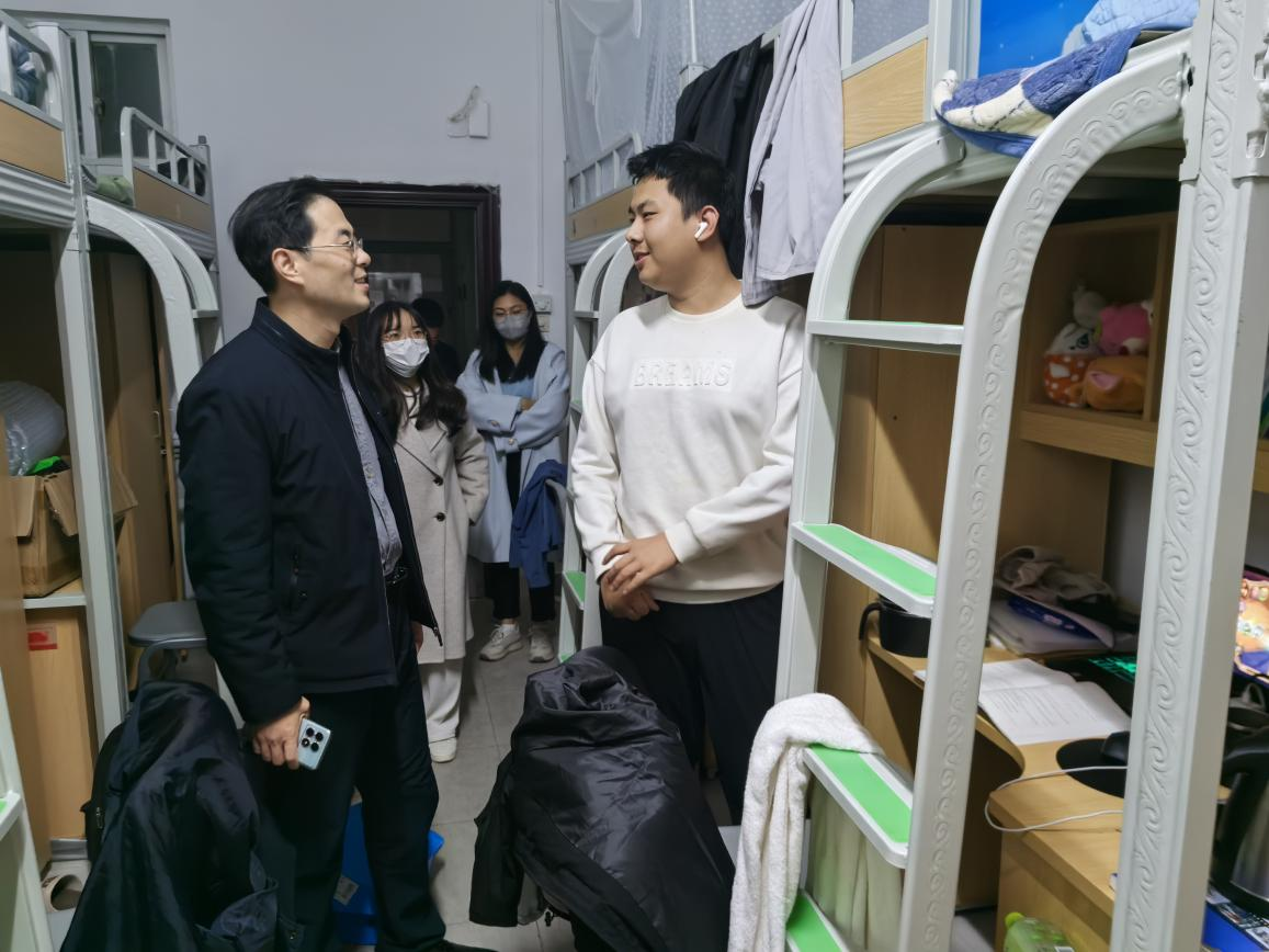 学院党委副书记孙鋆深入学生宿舍,为考研学子送去温情关怀。勉励同学们要坚守考研,饮食作息规律,劳逸结合,放平心态,一站成硕。