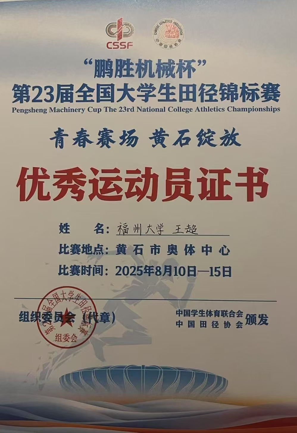 2025年8月10日至15日,第23届全国大学生田径锦标赛在湖北黄石火热开赛,机械学院研究生王超、陈威表现突出,获得男子100米全国第五名(一级运动员水平)、200米全国第四名和4×100米全国第五名,王超获评“第二十三届全国大学生田径锦标赛优秀运动员”,创造了学院体育赛事的历史最好成绩!助力海角视频 取得该赛事的历史最好成绩,并连续两届获评“体育道德风尚奖”,为学校赢得荣誉!