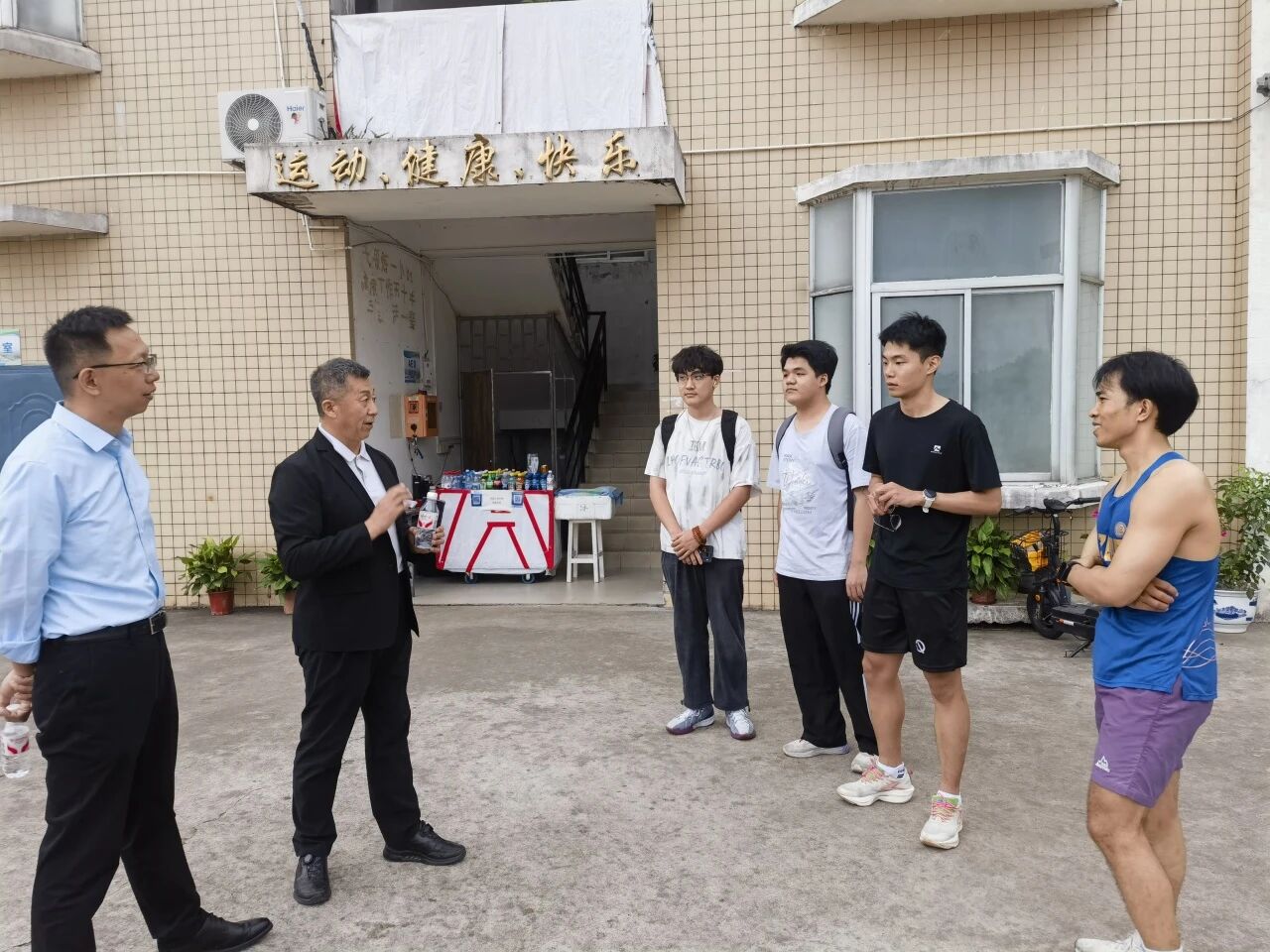 1989级院友张彦君学长、2002级院友赵绍融学长一行,在学院党委副书记谢武老师、学院团委副书记李辉容老师的陪同下,专程前往学校田径场,亲切看望正在紧张备战的运动员们,为他们加油鼓劲。