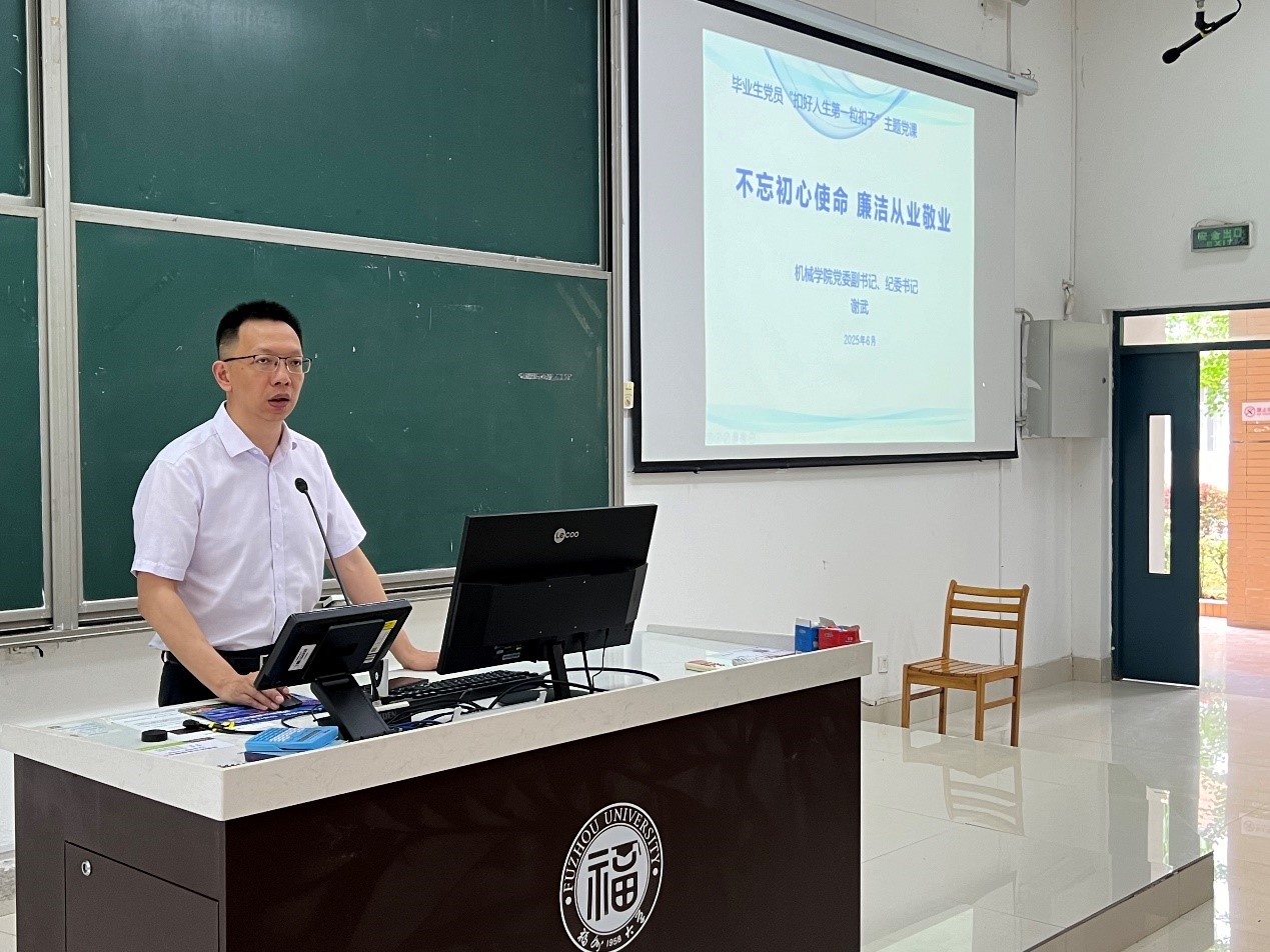 专题党课开始之前,谢武副书记对2025届毕业生党员顺利完成学业任务表示祝贺!他指出,毕业不仅是一个身份的转变,更是走向社会、走向岗位、走向未来的关键一步。在中国式现代化建设新征程中,机械学子肩负重任、使命光荣。他希望,全体党员要坚守初心、不辱使命,勇于担当、严于律己,走好人生“第一步”,走稳从业“每一步”。
