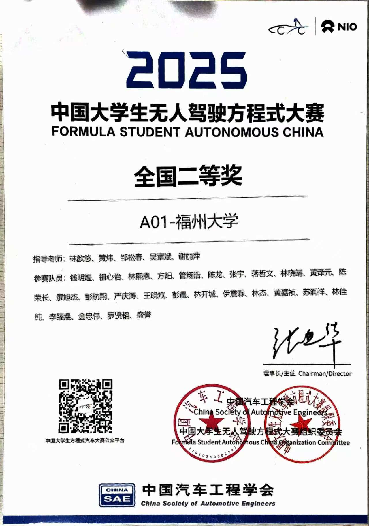 K-night赛车队在强手如林的赛场中屡创佳绩,不仅展现了福大学子在智能驾驶、新能源汽车等前沿领域的扎实功底与创新潜力,更体现了学校深化新工科建设、推进产教融合的育人成果。未来,学院将继续以赛事为契机,聚焦技术创新与人才培养,在智能网联汽车的赛道上勇毅前行,为中国汽车工业高质量发展注入青春力量!