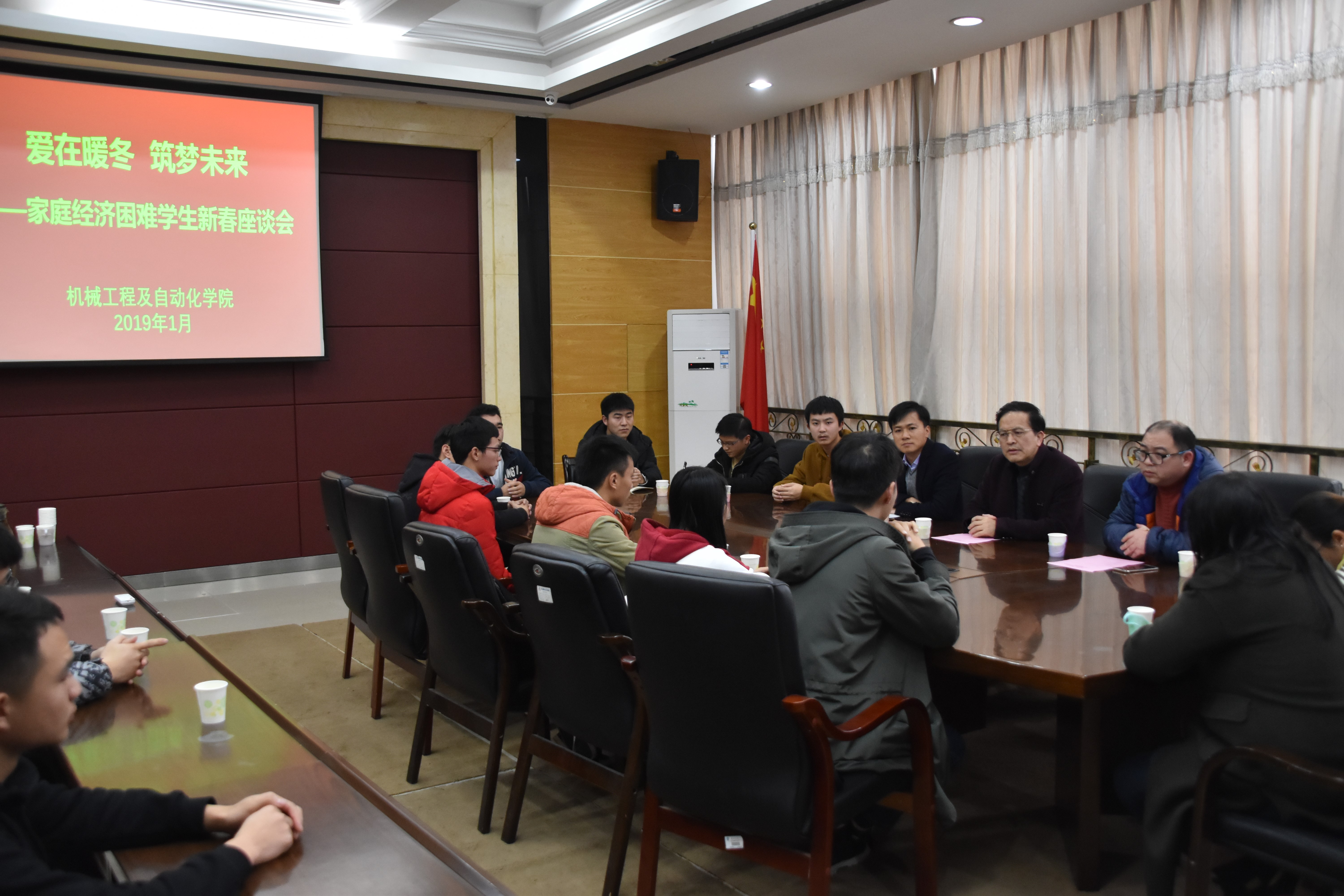 于机械院楼南401会议室举办“爱在暖冬,逐梦未来”——家庭经济困难学生暖冬大礼包发放仪式暨新春座谈会。院党委书记陈为旭研究员、院长姚立纲教授、院党委副书记林文麟老师、副院长向红亮教授、院党委正科级组织员刘旭莹老师、团委副书记林成金老师及各年级辅导员、家庭经济困难学生代表出席会议,会议由林成金老师主持。
