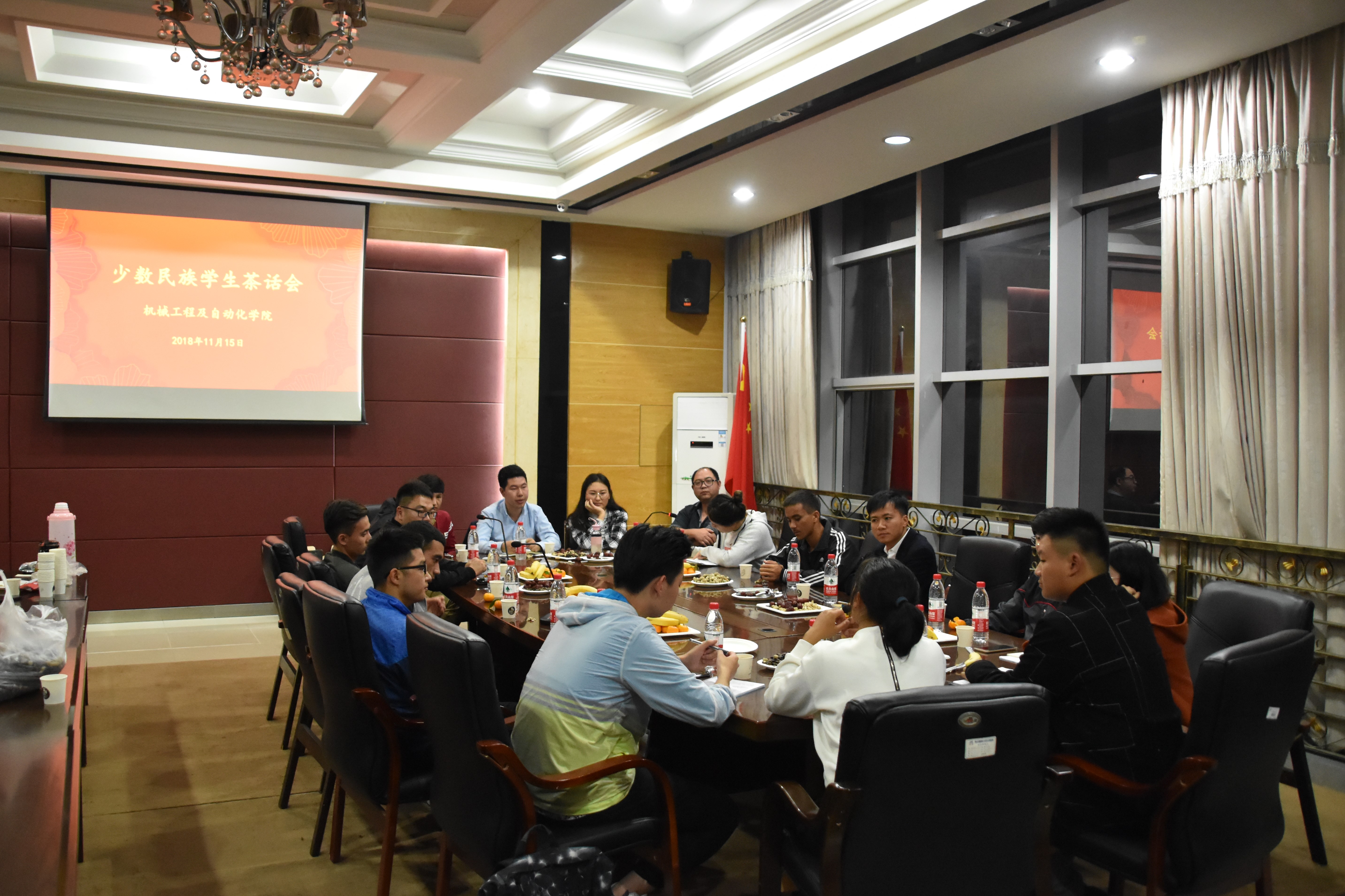 于机械院楼南401召开新疆籍少数民族学生茶话会。院党委副书记林文麟老师、团委副书记林成金老师、学生工作部(处)胡马尔老师、各年级辅导员以及10名少数民族学生参加了茶话会。会议由2017级本科生辅导员陈伯豪老师主持。