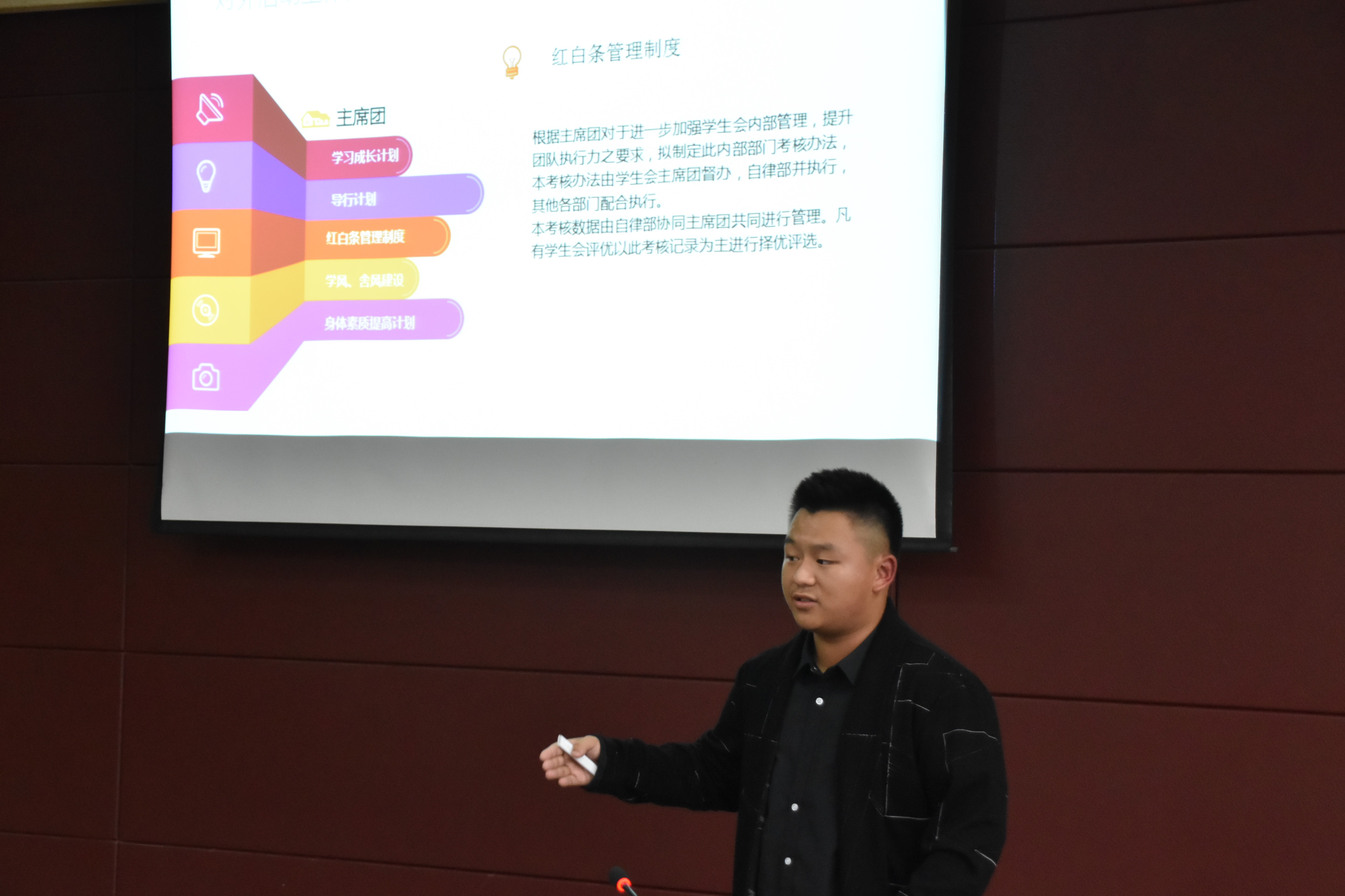 2018级段学生会主席周柏屹、团委副书记吴雨婷、副主席林辉圣和赵冰以及权益部部长唐乐彬分别汇报了各自分管的部门及架构,并对近期开展的工作以及未来规划进行了汇报。其中周柏屹同学特别指出段学生会是老师和同学之间沟通的桥梁,其由各班班长团支书担任部长,由各班的委员担任各个部门的干事。以“承担责任、拒绝平庸”为年级精神,积极开展以“创新方法助学习,榜样力量帮我行”为主题的导行计划。围绕导行计划,段学生会全面开展基础文明建设和班风学风建设,以及以学习成长计划为核心开展“吃鸡学习法”等一系列活动。