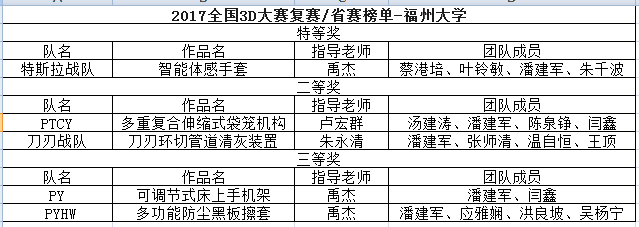 2017年10月,海角视频 机械学子于2017全国3D大赛复赛/省赛中取得佳绩,硕果累累。其中“智能体感手套”作品获得特等奖,“多重复合伸缩式袋笼机构”作品与“刀刃环切管道清灰装置”作品获二等奖,“可调节式床上手机架”作品与“多功能防尘黑板擦套”作品获三等奖。
