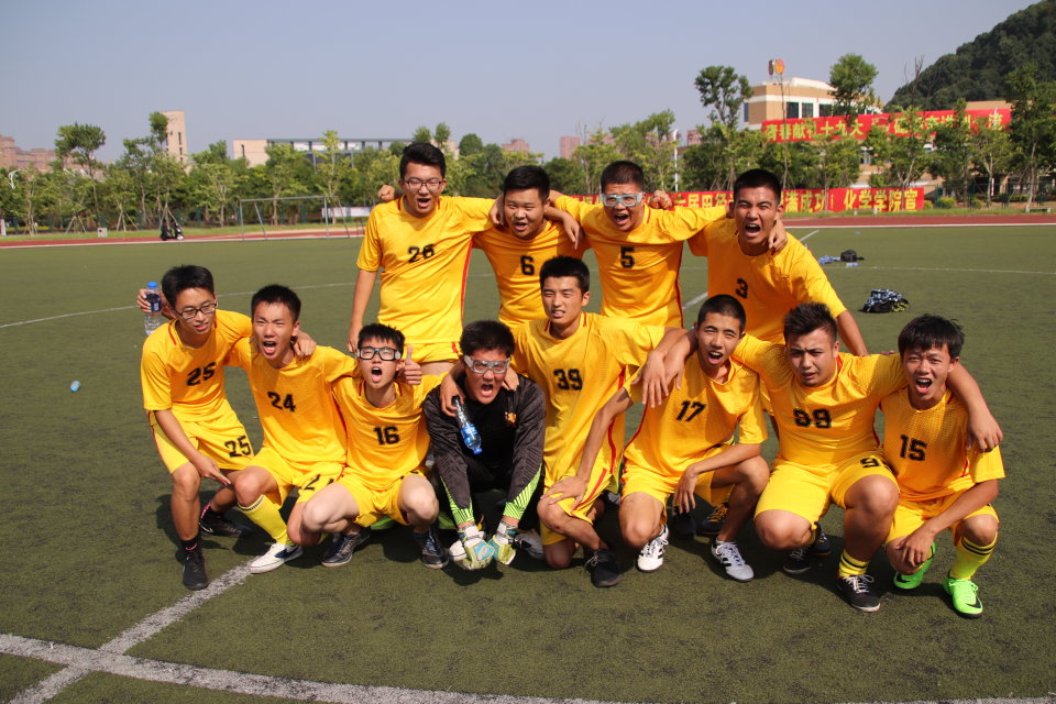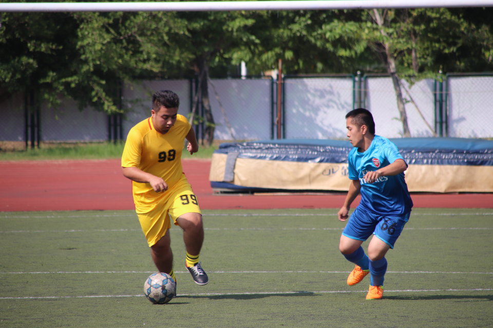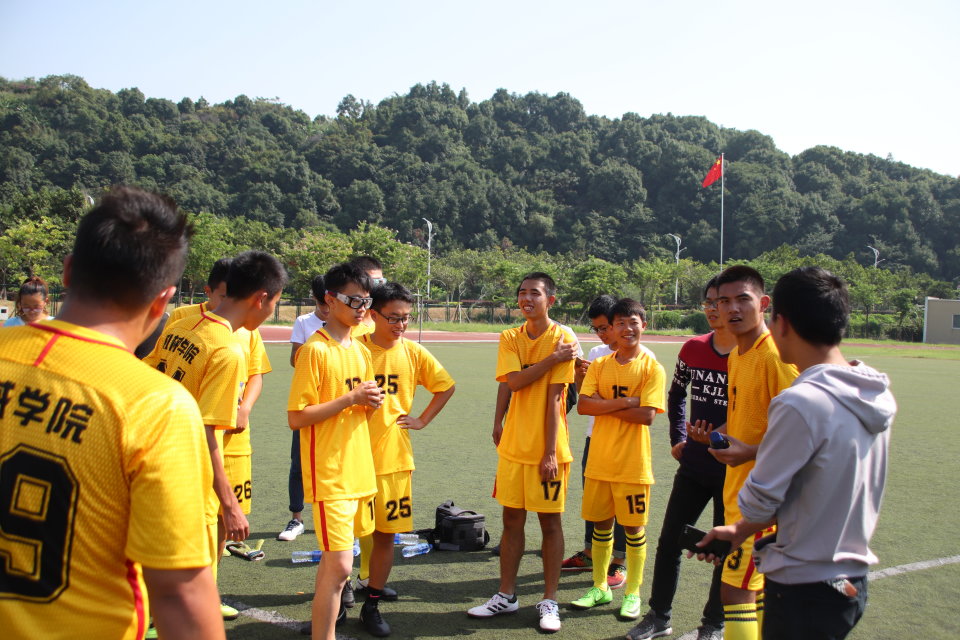 随着主裁判的一声哨响,比赛拉开帷幕,不论是身着蓝色球服的经管队员还是穿着黄色球衣的机械队员,立马进入状态,比赛立刻进入白热化。开场约十分钟,经管1号球员率先打破僵局,突破我方中后卫,从禁区左侧射门,成功攻入一球。在接下来的比赛中我方球员严防死守,将球控制在中场,让经管队员无法突破,双方进入胶着状态。