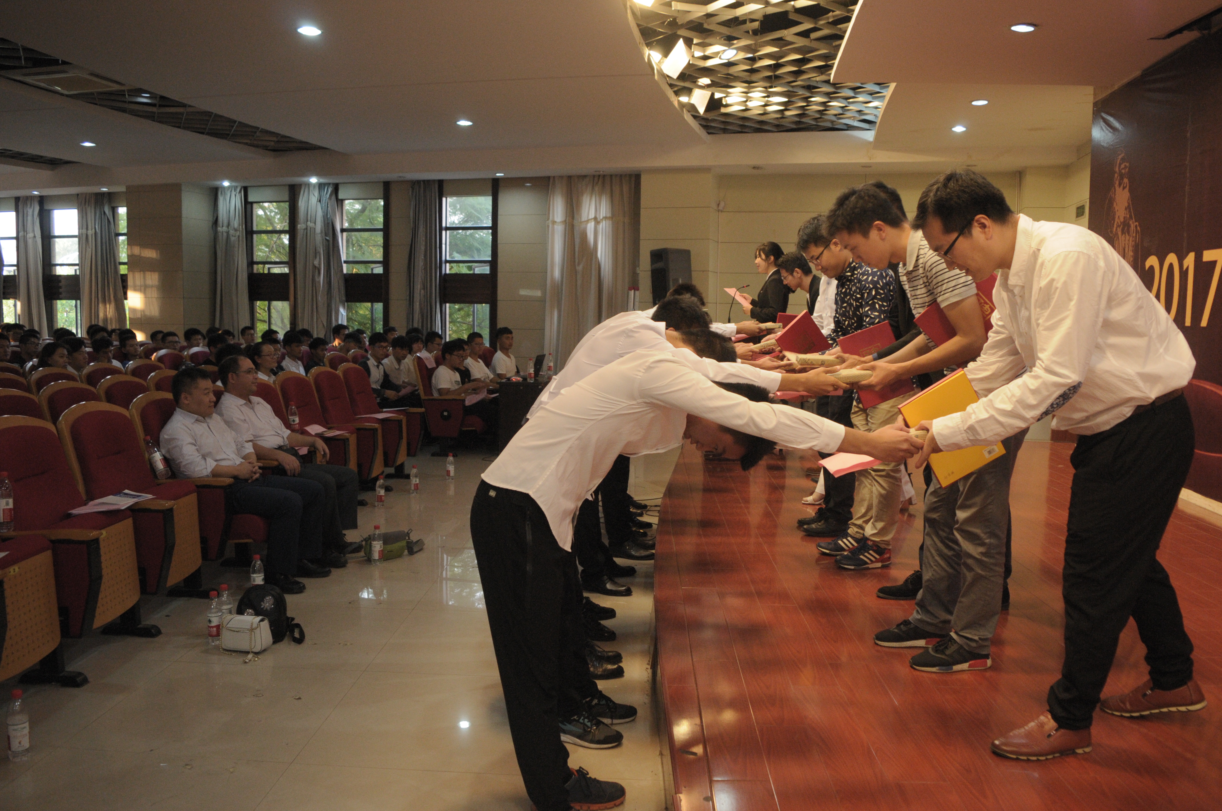 随后,仪式正式开始,本次仪式采用古代拜师礼的形式。9位班主任登台受礼,何炳蔚教授首先为新生班主任颁发聘书。紧接着,各班学生代表向各班班主任呈递拜师帖并行拜师礼,全体学生起立朗读拜师帖并行拜师礼。