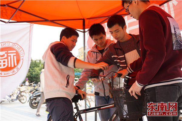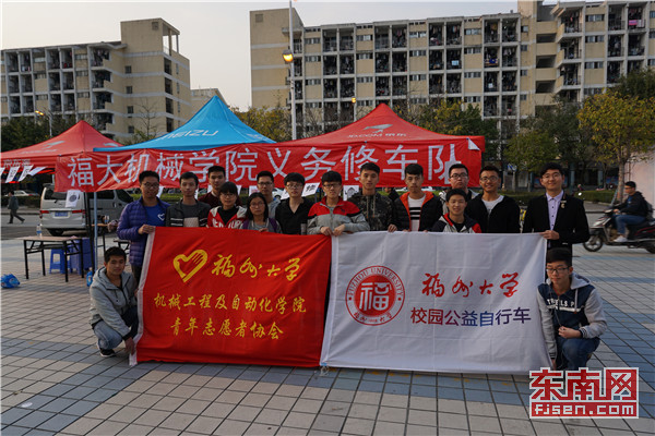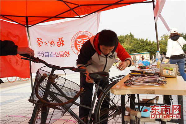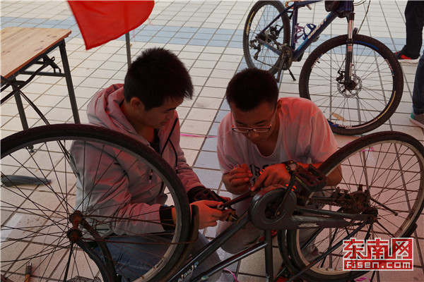 机械学院青年志愿者协会成员齐聚福大青春广场,开展义务维修自行车志愿服务活动。同学们纷纷打趣道:“修仙”不如修车。