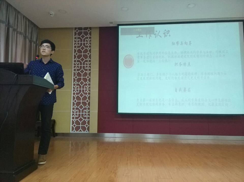 第二环节为班导及学院学生会主席团成员对各班委的述职作评价。院学生会主席林凯学长就ppt的选择提出来自己的意见,指出各班班委要进一步创新思路,加强自我管理,做好领头羊引领工作。