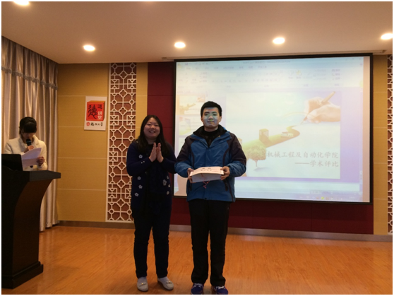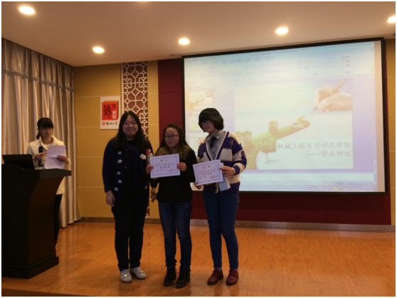 机械学院第一届学术之星”系列评比活动于2016年1月19日在机械北楼415教室顺利举行。出席本次活动的嘉宾有研究生辅导员贾静老师、学生会主席方长胜。此外,2015级全体研究生参与了本次活动。