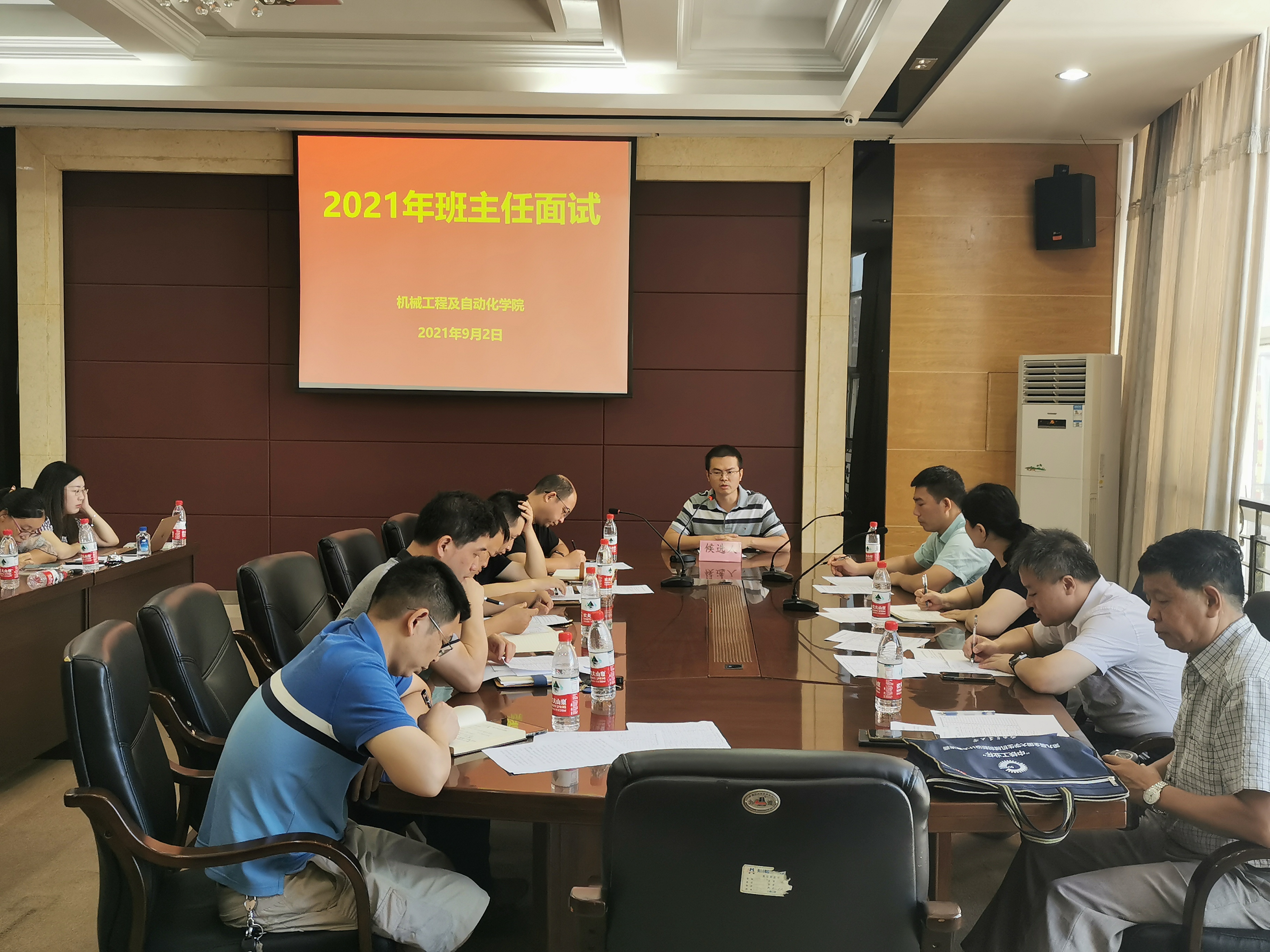 为进一步深入实施思想政治工作质量提升工程,大力推进“三全育人”综合改革,充分发挥班主任在学生学习教育管理中的作用,适应新形势下大学生思想政治教育和人才培养工作需要。9月2日上午,机械学院在机械南楼401会议室举行2021年班主任选聘面试工作。院党委副书记(主持工作)叶青、院长钟舜聪、院党委副书记林文麟、副院长何炳蔚、副院长张俊、院关工委常务副主任蓝兆辉、系主任及学工组参加选聘面试会议。