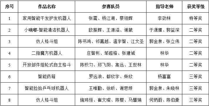 代表队斩获8个奖项,包括特等奖1项、二等奖4项、三等奖3项。其中,机械学院李劲林老师指导,本科生张震、杨江湖、蔡翎辉制作的参赛作品“家用智能干发护发机器人”荣获特等奖,该作品所在赛项在本届大赛全国决赛一共颁发了197项奖项,特等奖仅6项。