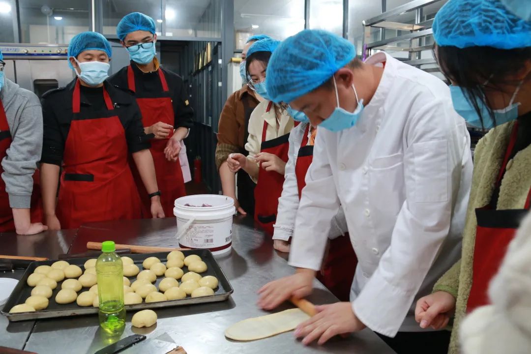 3月18日下午,同学们来到紫荆园餐厅,首先参观了食材加工区、食材储存库房等食堂工作间。参观过程中,同学们了解到目前学校食堂的现代化水平很高,里面有各种各样的设备,包括烤箱、面团机、烤箱等,可以根据不同的面包和糕点种类选择使用设备。随后同学们在现场师傅的带领下学习了面包制作的方法和技巧。通过师傅的讲解,同学们迅速掌握了不同种类面包的制作方法,随即投入到热火朝天的制作过程中。大家齐心协力,最终完成了面包制作任务,一起品尝了自己的劳动成果。