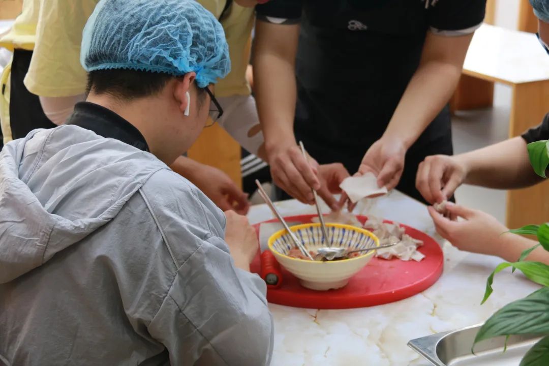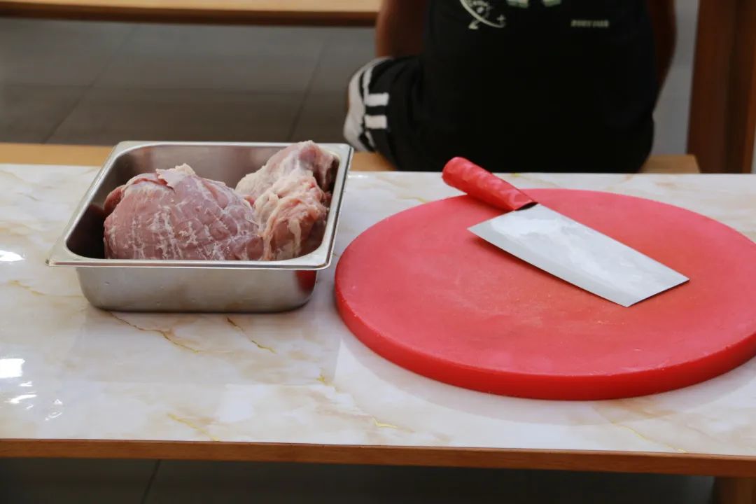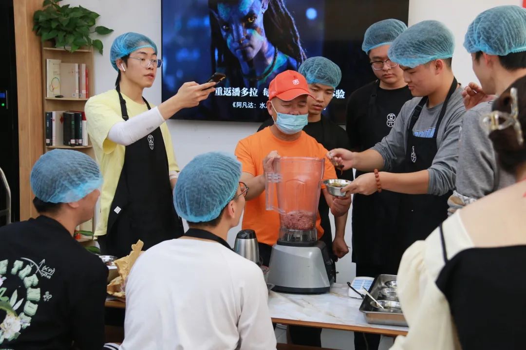接下来就到了制作馅料的部分,师傅首先把瘦肉上白色的筋给剔除,然后把瘦肉切成条状,再由条状变成丁状,最后加入盐,味精,鸡精,生抽,蚝油,鸡蛋,葱和姜丝,放入破壁机将其搅拌。到了同学们动手环节,看着同学们手忙脚乱的进行剔筋,把瘦肉切块后,一旁的师傅们也进行了指导,并上手展示了其中的技巧:切瘦肉的时候,按着肉的四个手指的指关节要顶着菜刀的一边,才能切得更快;进行剁肉馅的时候,要动用手腕的力量更省力,可以把肉剁的更细密。在师傅的指导下,同学们慢慢地切的越来越好。