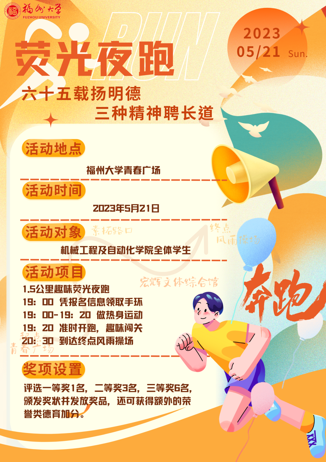 为延续并传递艰苦奋斗、严谨求实、勇于拼搏三种精神,以及弘扬福大校训“明德至诚,博学远志”,让机械学院学子感悟过往不易、勇攀未来高峰,促进机械学院学子进行身体锻炼、养成良好作息,现开展“六十五载扬明德,三种精神骋长道”荧光夜跑活动。