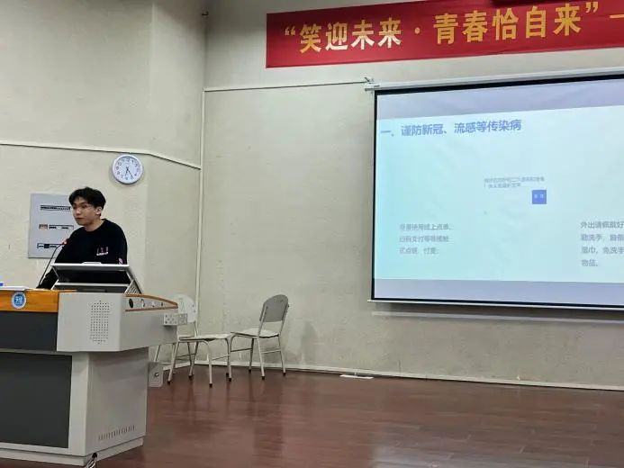 疫情防控岗副段长叶辉强调了五一假期的安全问题,在传染病防控、防溺水、防火、防骗以及交通安全五个方面进行了详细讲解并重点强调了需特别注意的事项。与此同时,也提醒同学们五一期间应加强自身的思想意识教育,遵守法律法规,严禁参与非法宗教、传销等非法活动。