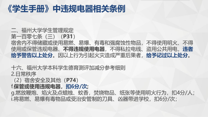 宿舍管理岗副段长郑智杰通报了上周校检情况及本学期校检上榜情况,介绍了安全检查的校检工作细则,简述了一些院检注意事项,并详细讲解了《学生手册》中违规电器相关条例。提醒全体同学在本周四宿舍安全隐患排查前做好全面自查、整改。