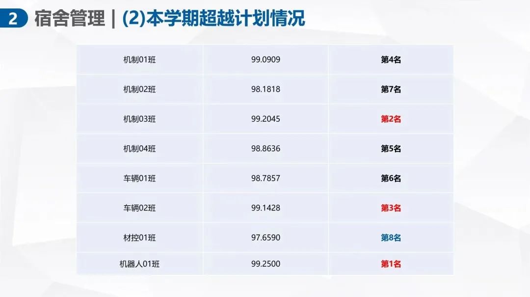 宿舍管理与心理健康岗副段长郑智杰首先对上学期“星级宿舍”结果与本学期“超越计划”情况进行了公示,并详细讲解了院检工作细则。强调本学期将严格落实每日晚点名与每周四卫生检查制度,同时列举了相关评比标准。最后,介绍了安全检查、晚熄灯检查、卫生检查、晚点名检查与晚点专项巡查五方面的校检工作细则,并说明了销假手续与申诉流程,同时提醒大家遵守校规校纪,为建设文明宿舍贡献出自己的一份力量。