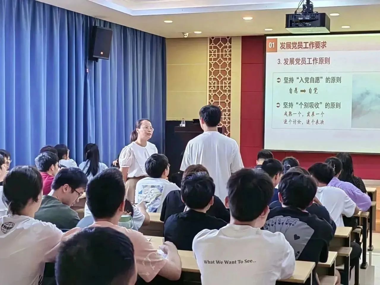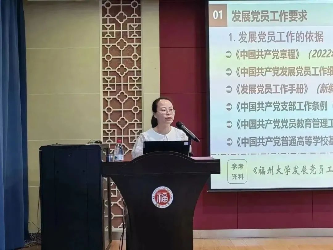 首先,赵艳莉老师从发展党员工作的依据、总要求、原则、计划的制定四个方面介绍了发展党员的工作要求,重点指出发展党员应当根据“控制总量、优化结构、提高质量、发挥作用”,坚持入党自愿和个别吸收的原则,成熟一个,发展一个。随后,赵老师从申请入党、确定入党积极分子、确定发展对象、接收预备党员、预备党员转正等五个环节、三十个步骤,深入浅出地梳理了发展党员的必要工作流程与工作细节。最后,赵老师强调了发展党员工作重点,她表示,要严把发展党员质量,“抓住政治标准牛鼻子”,禁止突击发展、反对“关门主义”,改进薄弱环节,着重改进培养质量、材料质量和会议质量等问题,认真使用党支部工作手册,扎实做好党建工作。